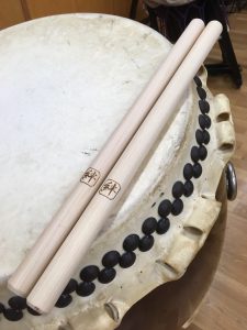 焼印は、平面でしか作れませんが、押すものがほんの少しのR面(曲面)であれば、小さいものであればこのようにきれいに押せます。こちらは糸島二丈絆太鼓のバチです。福岡県糸島市二丈に拠点を置く子ども達の太鼓集団です。「絆」の焼印入りで、フランスにも遠征します!